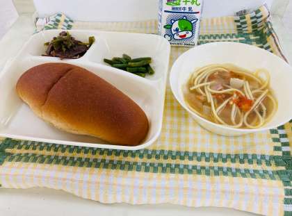 今日の献立は「牛肉の香味焼き、ほたて貝とトマトのスープスパゲッティ、さんどまめのサラダ、黒糖パン、牛乳」でした。
