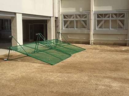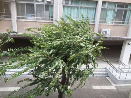 台風11号が接近しています。大阪でも風が強くなってきました。雨や暴風による事故を防ぐため、校庭の防球ネットを倒したり、プールの用具を倉庫に片付けたりしています。