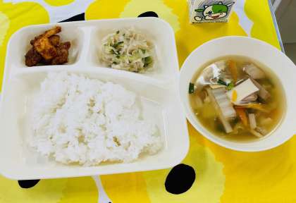 今日は小学部は全校遠足、9年生はコリアタウンフィールドワークのため、給食を食べたのは7・8年生のみでした。献立は「鶏肉のチリソース焼き、焼き豚とワンタンの皮のスープ、切干しだいこんのごま辛みづけ、ごはん、牛乳」でした。