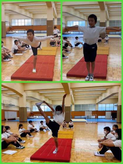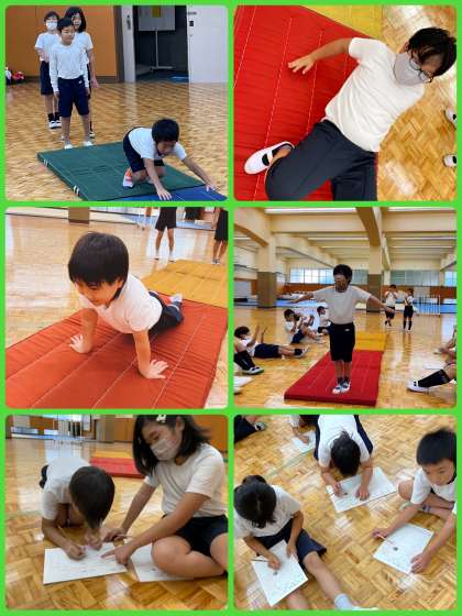 3年生は体育で、マット運動をしています。この日は、お話のリズムに合わせた様々な動きを表現しました。手を着く位置、足の上げ方などを意識して、自分なりに表現することができました。