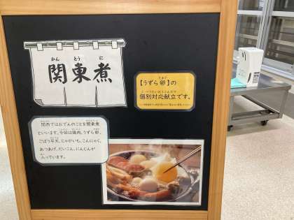 関東煮は【うずら卵】の個別対応献立です。ピンクの食器を使用し、誤食予防のため一番はじめに配食します。
