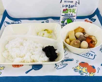 11月2日の献立は「関東煮、はくさいの甘酢あえ、のりのつくだ煮、ごはん、牛乳」でした。関西ではおでんのことを関東煮といいます。今回は鶏肉、うずら卵、ごぼう平天、じゃがいも、こんにゃく、あつあげ、だいこん、にんじんが入っていました。