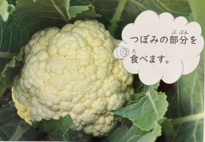 カリフラワーには「キャベツの花」という意味があります。キャベツと同じ種類の野菜で、11月から3月頃にたくさんとれておいしくなります。カリフラワーにたくさん含まれているビタミンCには、傷を治りやすくするはたらきがあります。