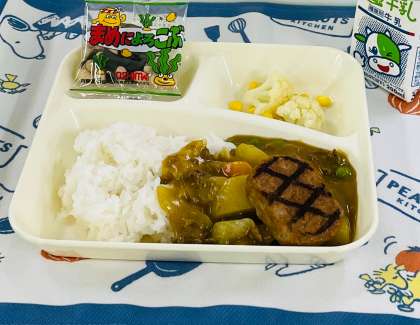 11月4日の献立は「ハンバーグカレーライス、カリフラワーのピクルス、豆こんぶ、牛乳」でした。