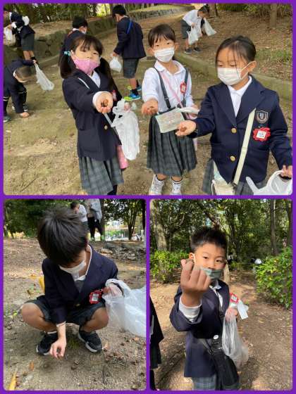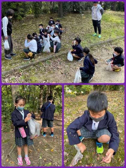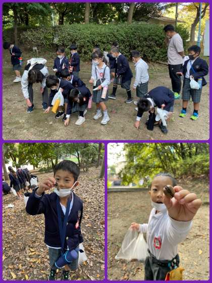1年生は、校区の公園へ秋みつけに行きました。紅葉にふれ、季節の移り変わりを感じ、どんぐりをたくさん見つけることができました。この後、図工の学習でどんぐりを使ってオリジナルの飾りを作っていきます。