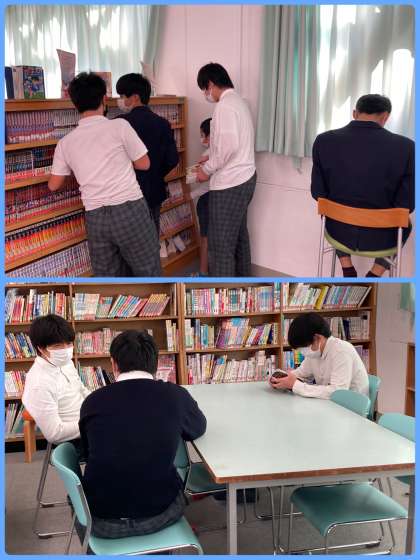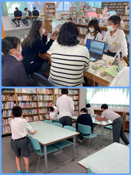 昼休みは毎日、図書室を開放しています。たくさんの児童生徒が来ており、食後にリラックスして本を手にとり、午後の授業へ気持ちを落ち着かせてのぞむことができている様子です。この日は、3年生に本を紹介している9年生がいて、小中一貫校ならではの微笑ましい光景が見られました。