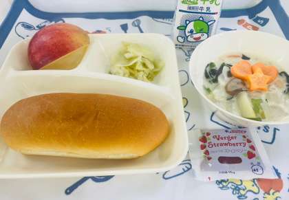 11月9日の献立は「きのこのクリームシチュー、キャベツのピクルス、りんご、コッペパン、いちごジャム、牛乳」でした。
