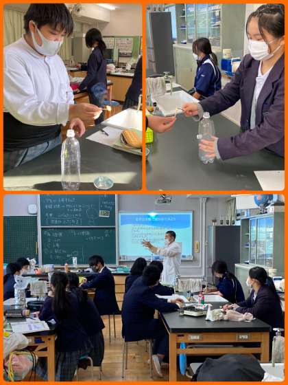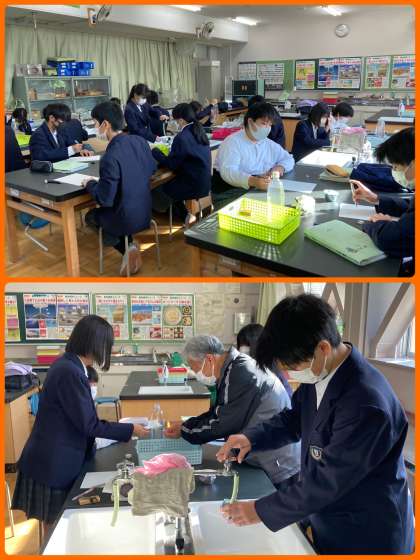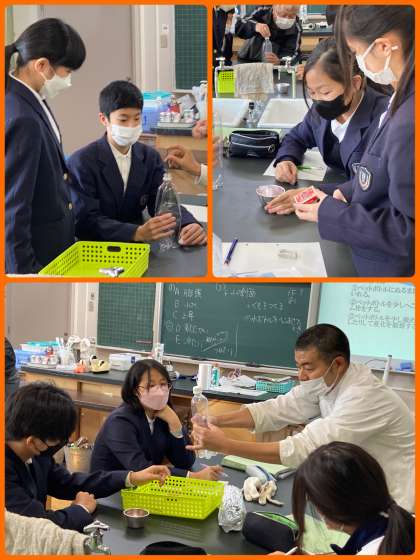 8年生は理科で、雲ができる条件について調べました。空気の上昇による様々な変化を考え、ペットボトル内に雲を作っていきました。マッチの火やカセットコンロを慎重に扱いながら、班で協力して進めることができました。
