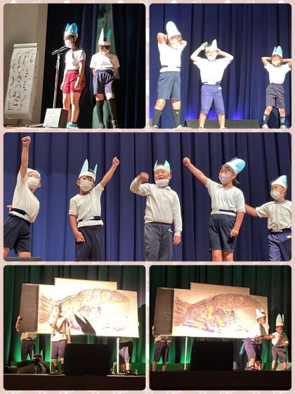 2年生は、11ぴきのねこの劇で仲間の大切さや、思いやりの気持ちを1年生〜9年生に伝えました。幕間の移動の仕方や、抑揚をつけて表現することなども学び、実りある取り組みとなりました。