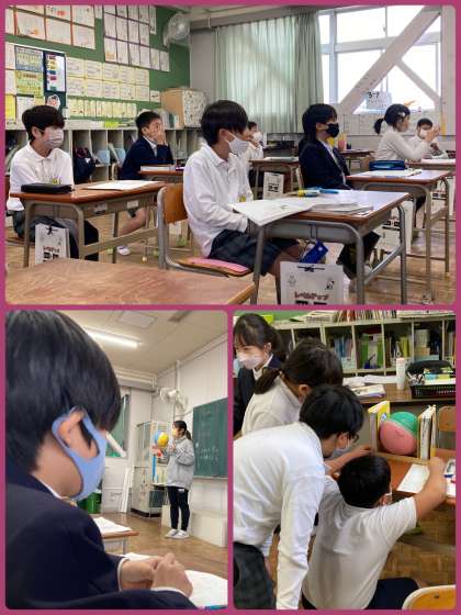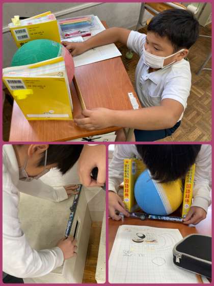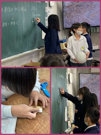 3年生は算数で、長さの学習をしています。この日は、球の直径や半径を求める方法を考えました。友だちと協力して、助言し合いながら測っていきました。
