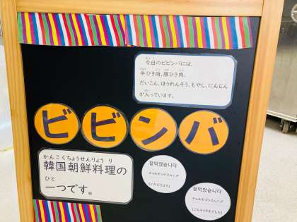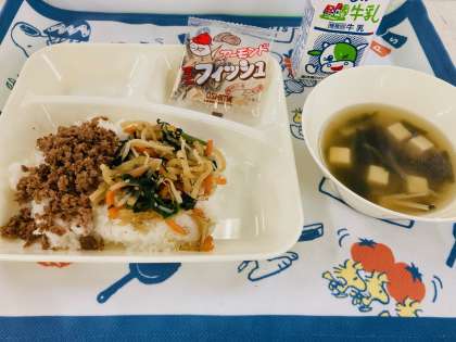 今日の献立は「ビビンバ、わかめスープ、アーモンドフィッシュ、牛乳」でした。