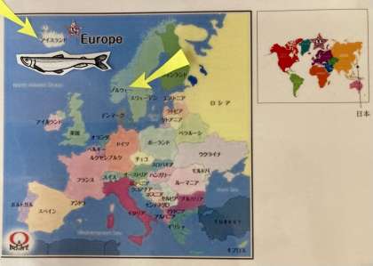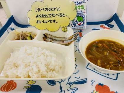 今日の献立は「焼きししゃも、和風カレー汁、まいたけとキャベツのいためもの、ごはん、牛乳」でした。ししゃもは、北海道の太平洋岸にすむキュウリウオ科の魚です。川で生まれ、海で1年半くらいかけて成長した後、10〜11月ごろには再び川をさかのぼって卵を産みます。給食に使われているししゃもは、カラフトシシャモ(カペリン)と呼ばれる魚です。今日は、アイスランド。ノルウェー産のものが届いていました。