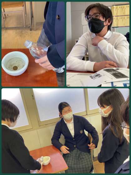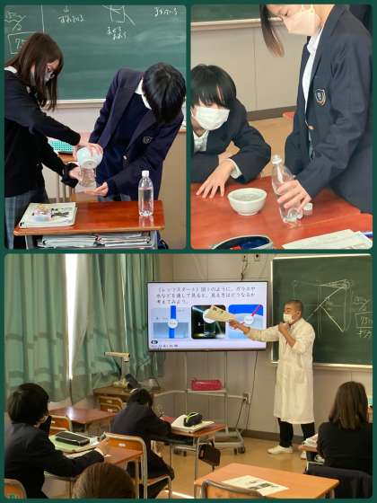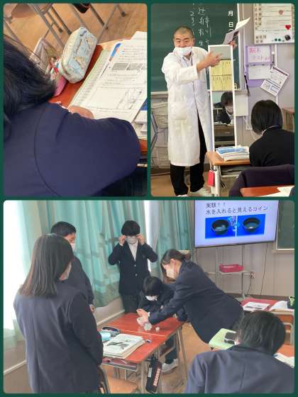 7年生は理科で、光の屈折について学習しています。この日は、水を通して見ると、見え方はどうなるのか実験しました。カップに入れたコインが見えない時でも、水を入れると見える状態をみんなで確認できました。