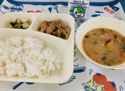 今日の献立は「豚肉のしょうが焼き、さつまいものみそ汁、きくなとはくさいのごまあえ、ごはん、牛乳」でした。