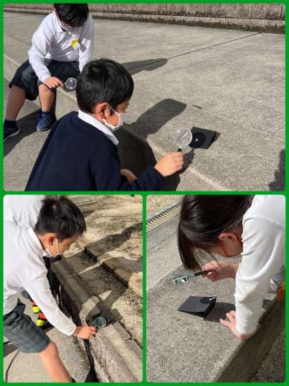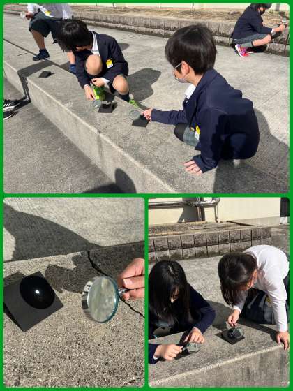 3年生は理科で、レンズのはたらきについて調べました。虫めがねを通した光を黒い紙に集めた時、どんな変化が起こるのか実験していきました。予想外の変化にびっくりしている子もいました。