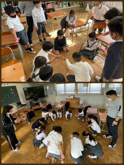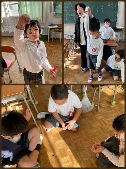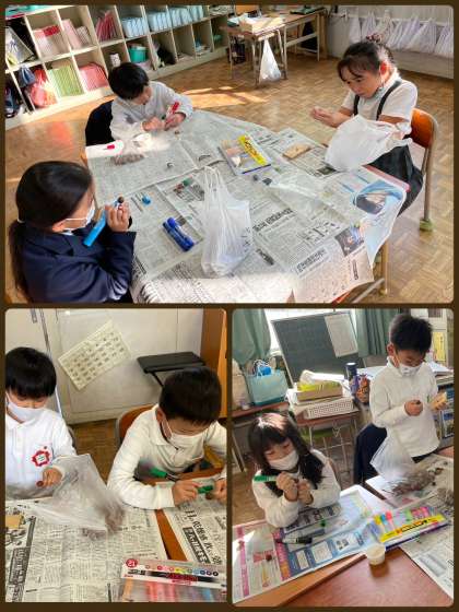 1年生は、校区の公園の秋みつけで拾ったどんぐりを使って、こまを作りました。そして、クラスでどんぐりごま大会をしました。みんな必死になって回していました。