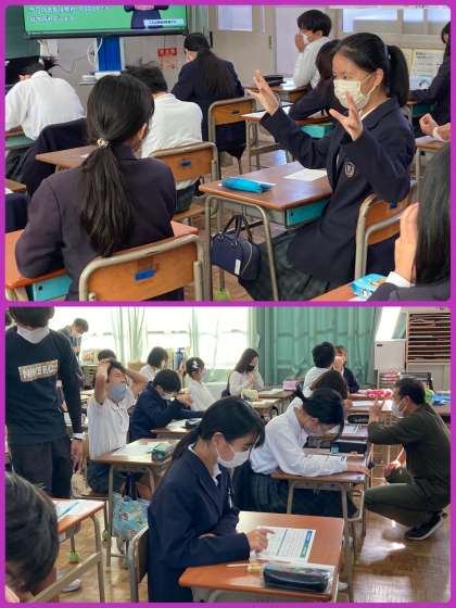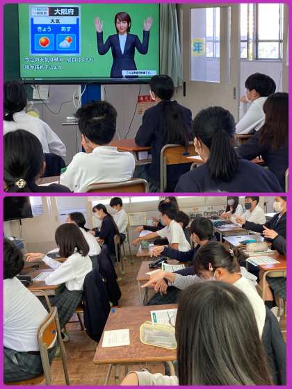 6年生は、聴覚や視覚に障がいをもっている人たちとのコミュニケーションの手段である「手話」や「指文字」を覚えたり、使ったりしました。そして、障がいをもっている人たちと共に支え合って生きていくにはどうすればよいかを考え、ワークシートに記入していきました。