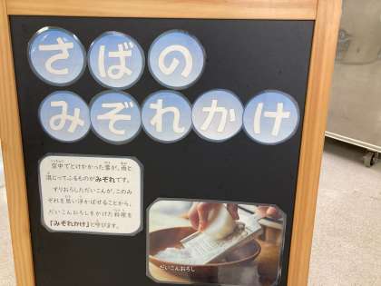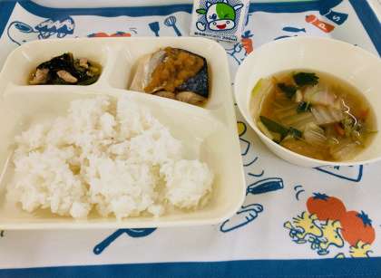 今日の献立は「さばのみぞれがけ、すまし汁、こまつなの煮びたし、ごはん、牛乳」でした。