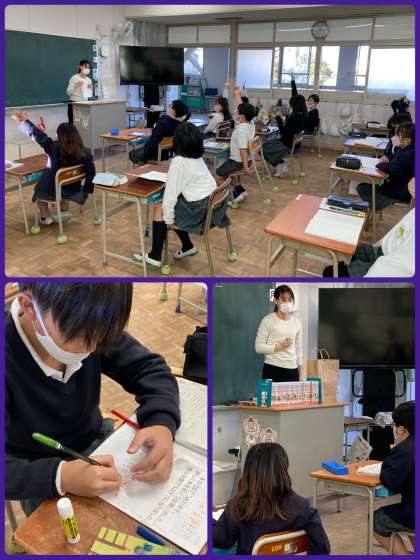 3年生は算数で、未知の数量を表す□を用いて、数量の関係を式に表していきました。図書室から借りた本を具体物に使い、イメージをふくらませながら考えていきました。場面を式や図に表せることのよさに気付き、今後の生活や学習にも活用してほしいと思います。