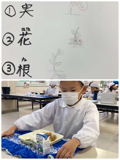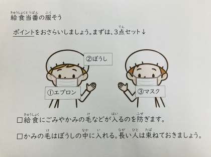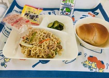 今日の献立は「和風焼きそば、きゅうりのしょうがづけ、いり黒豆、1/2黒糖パン、牛乳」でした。給食当番は服そうを整えて、衛生的に給食の準備をしましょう。