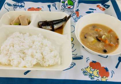 今日の献立は「いわしのしょうが煮、みそ汁、高野どうふの煮もの、ごはん、牛乳、中学校:焼きのり」でした。