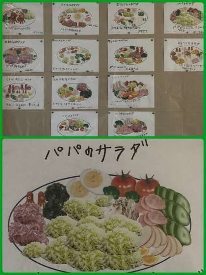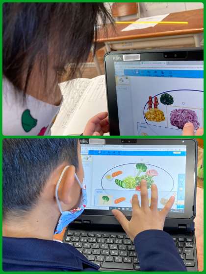 1年生はサラダでげんきの単元で、タブレット端末を使い、お世話になっている人に食べてもらいたいサラダを考えました。どんなものをサラダに入れたいか、自分の考えをはっきりと持ち、盛り付けも工夫しました。