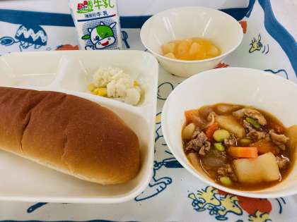 今日の献立は「豚肉と野菜のケチャップ煮、カリフラワーのピクルス、フルーツゼリー、黒糖パン、牛乳」でした。