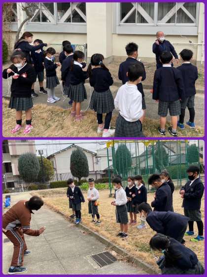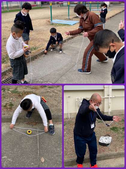1年生は、うまくひもを巻いてこま回しに挑戦しました。先生たちの見本を参考にしながら、チャレンジしていきました。