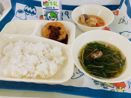 今日の献立は「鶏肉の土手焼き風、はりはり汁、れんこんのフライ大阪ソース味、ごはん、牛乳」でした。