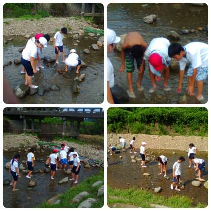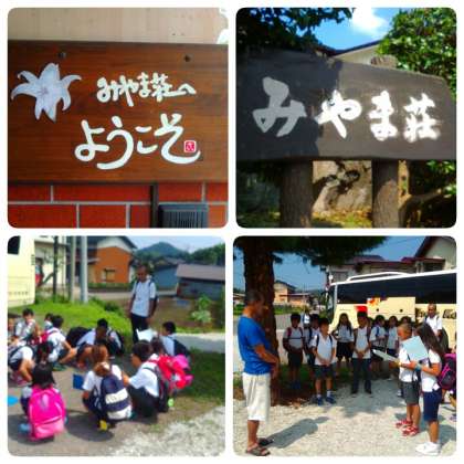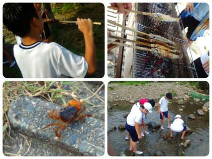今日からお世話になるみやま荘に到着しました。部屋で着替えて、次は魚つかみです。みんなで協力して捕まえました。美味しかったです??