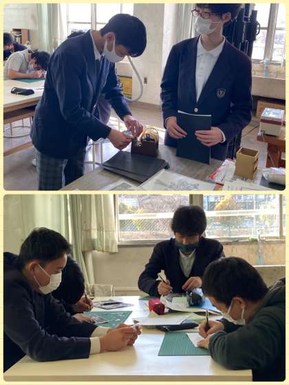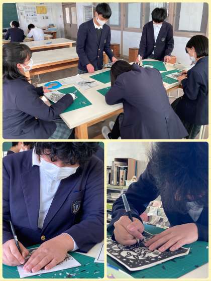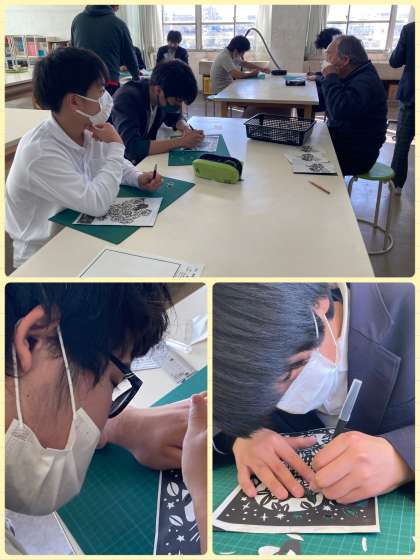 9年生は美術の学習で、切り絵に取り組んでいます。オリジナルのデザインを考えました。すごく細かな作業が必要ですが、根気強く丁寧に切り進めています。みんなで取り組む活動も、残り少なくなっています。