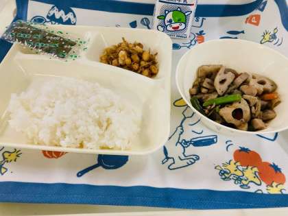 今日の献立は「筑前煮、じゃこ豆、焼きのり、ごはん、牛乳」でした。