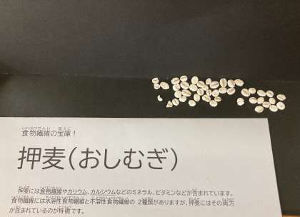 (写真上)大麦を精白し、蒸気で加熱して、やわらかくなったところをローラーで平たくしたものを「押麦」といいます。押麦には、腸の調子を整える食物せんいが精白米の20倍以上も含まれています。