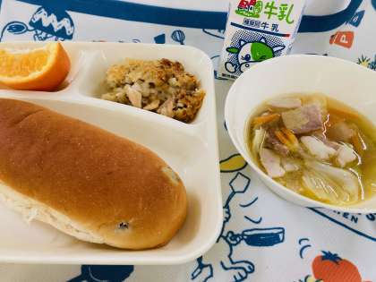 今日の献立は「押麦のグラタン、豚肉と野菜のスープ、いよかん、レーズンパン、牛乳」でした。
