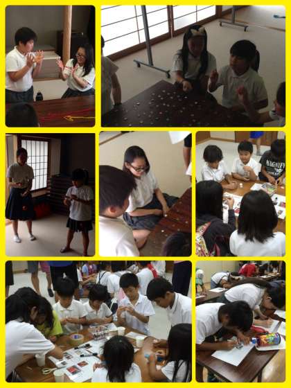 昼からは、矢田7校の小中学生が参加する「平和と人権を考える矢田子ども集会」が市民交流センターでありました。全体では、子連協のスライド劇や本校の取り組みなどを発表しました。その後、班に分かれて昔遊びやオキナワ研の体験コーナーを回りました。1,2年生も各班の中学生に手伝ってもらいながら楽しそうに活動していました。