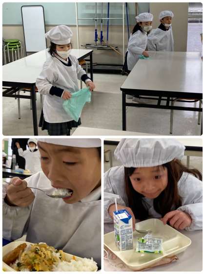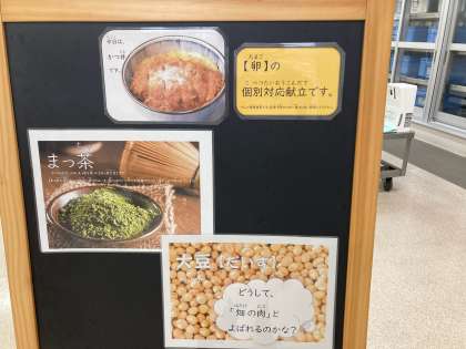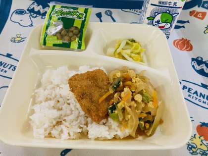 今日の献立は「かつ丼、はくさいの甘酢あえ、まっ茶大豆、牛乳」でした。