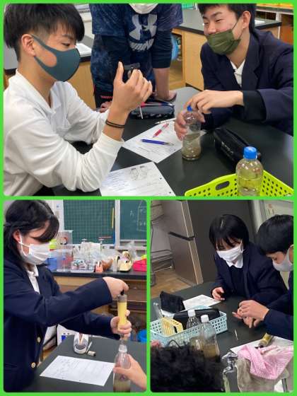 9年生は理科で、微生物のはたらきを調べるため、採取した土と焼いた土にデンプンのりを入れ、二酸化炭素の割合を測りました。小学校6年生の時に学習した気体検知管を使用し、班で協力しながら取り組みました。