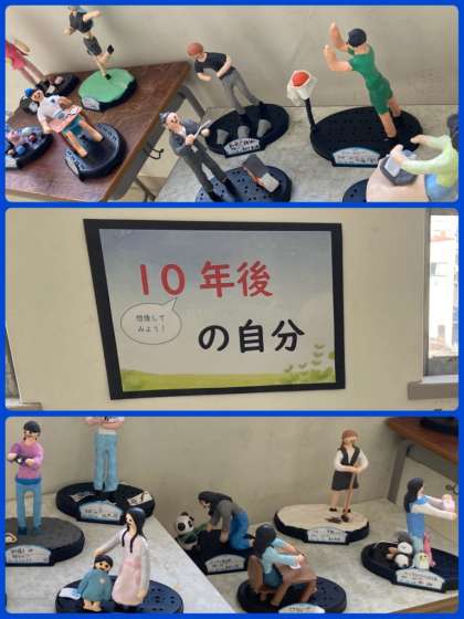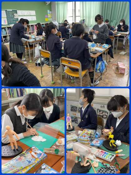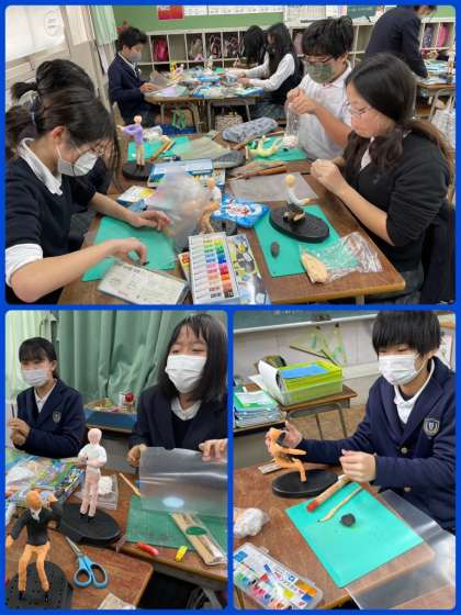 6年生は自分の10年後を想像して、立体作品で表現しました。土台に針金で骨組みを作り、丁寧にねん土をつけていきました。将来の自分が活躍している場面をイメージし、夢に向かう気持ちを高めながら取り組むことができました。