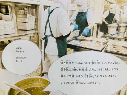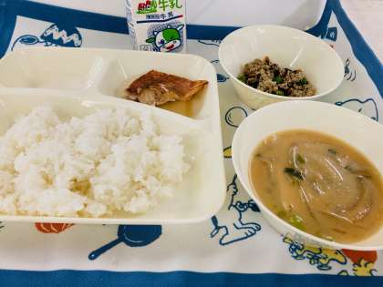 今日の献立は「あかうおのレモンじょうゆかけ、みそ汁、高野どうふのいり煮、ごはん、牛乳」でした。