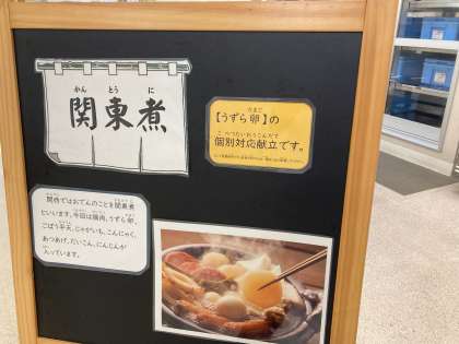 関東ではおでんのことを関東煮といいます。今回は鶏肉、うずら卵、ちくわ、じゃがいも、こんにゃく、あつあげ、だいこん、にんじんが入っていました。関東煮は【うずら卵】の個別対応献立です。