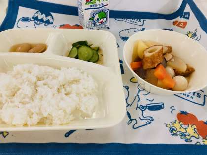 今日の献立は「関東煮、きゅうりの梅風味、白花豆の煮もの、ごはん、牛乳」でした。
