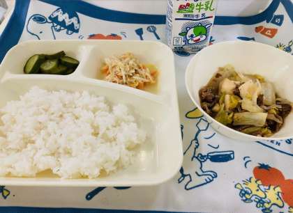今日の献立は「すきやき煮、もやしとささみのいためもの、きゅうりのゆず風味、ごはん、牛乳」でした。