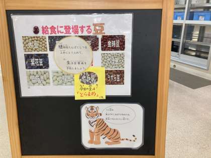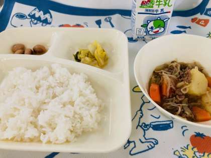 今日の献立は「肉じゃが、はくさいのゆず風味、とら豆の煮もの、ごはん、牛乳」でした。とら豆は、煮えやすく、ねばりがあるため、煮豆にするとおいしい豆です。