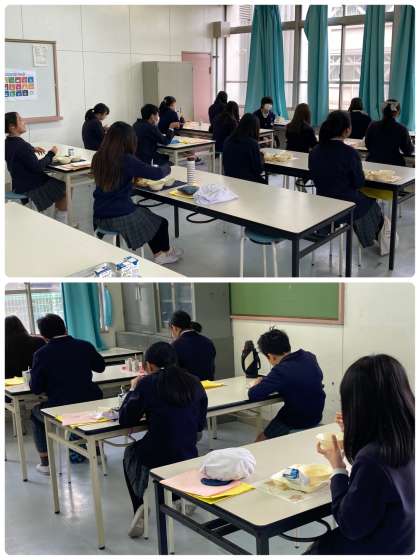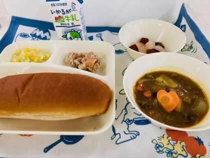今日の献立は「フライドチキン、カレーシチュ[米粉]、キャベツとコーンのサラダ、フルーツゼリー、黒糖パン、牛乳」でした。6年生の卒業をお祝いする気持ちと新たな進路へと羽ばたく9年生をお祝いする気持ちが込められていました。下2枚の写真は、6年生の喫食の様子です。
