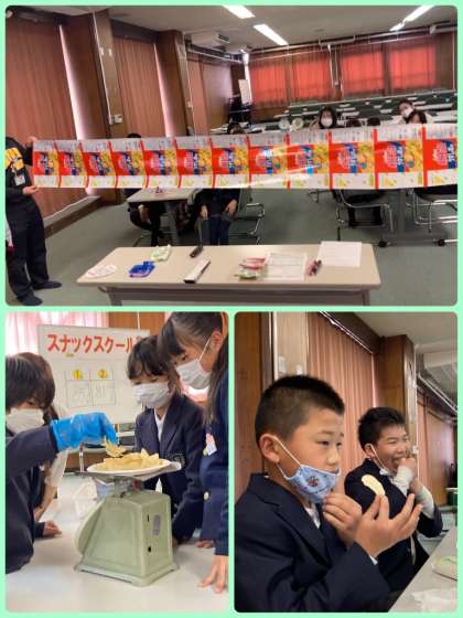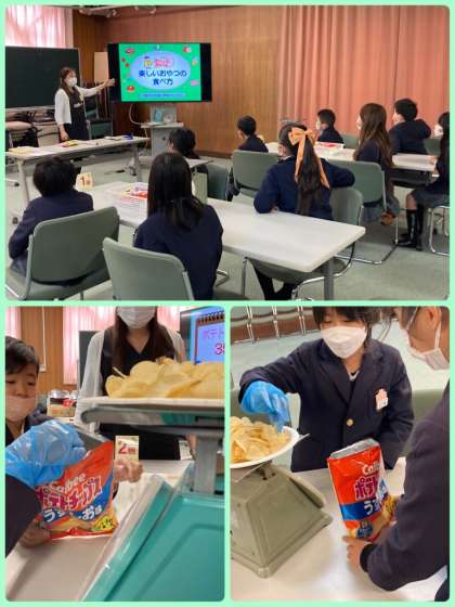 4年生は、カルビーの方にお越しいただき、スナックスクールにのぞみました。おやつの1日の目安量を学び、自分たちがふだん食べている量と比較しながら、見直す点を考えました。サッポロポテトに入っている野菜当てゲームでは、本物のお菓子を見ながら、どんな野菜が入っているのかを班で協力して考えました。