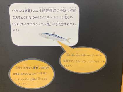 いわしには、体をつくるたんぱく質のほかに、脂質も含まれています。いわしの脂質には、脳の働きをよくするといわれるDHA(ドコサヘキサエン酸)、血液の流れをよくする働きがあると言われるEPA(エイコサペンタエン酸)が豊富に含まれています。今日は、いわしをフライにしているので、骨ごと食べることができ、骨や歯をじょうぶにするカルシウムもたくさんとることができました。