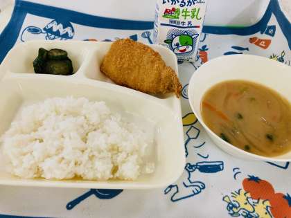 今日の献立は「いわしフライ、みそ汁、きゅうりの赤じそあえ、中学校:焼きのり、ごはん、牛乳」でした。