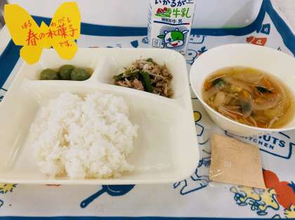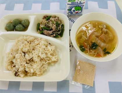 今日の献立は「豚肉と野菜のいためもの、すまし汁、きな粉よもぎだんご、小学校:ごはん、中学校:かやくご飯、牛乳」でした。