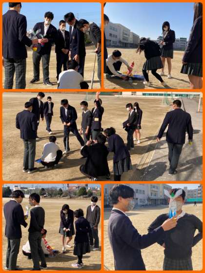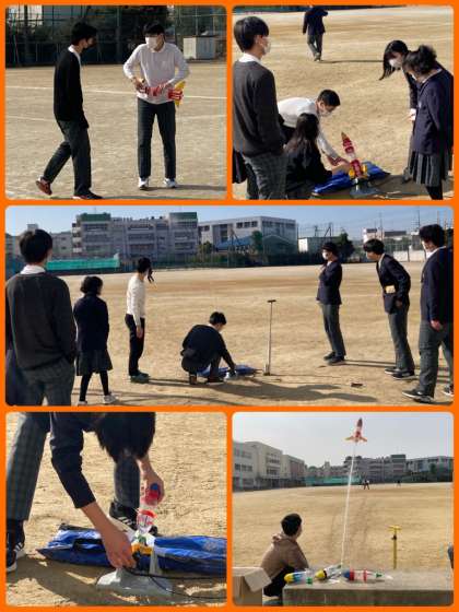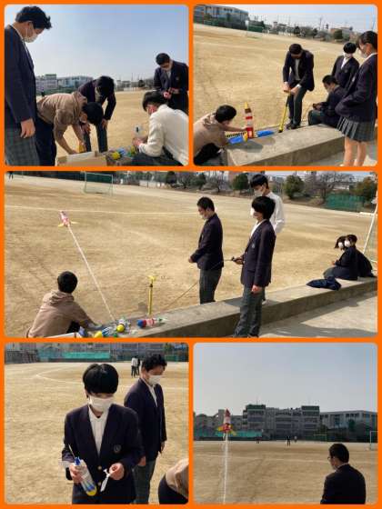 9年生は最後の理科で、ペットボトルロケットを飛ばしました。どうしたら遠くまで飛ぶのか、設置角度や水の量などを考えながら順番に空気を入れていきました。100mほど飛ばした生徒もいました。