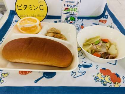 今日の献立は「鶏肉のカレー風味焼き、洋風煮、はっさく、黒糖パン、牛乳」でした。
